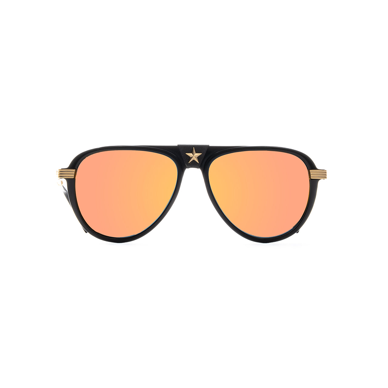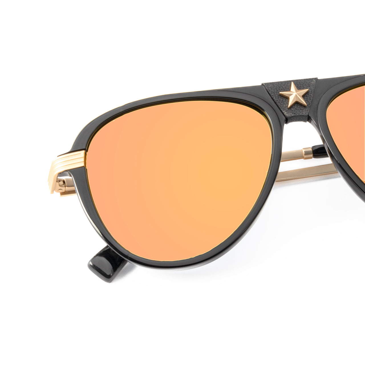 Don’t wear these if you're planning on blending in. Skyline is a big and beautiful acetate aviator with polarised lenses and gold mirror, iconic E star mark on temple tips and signature star on the bridge. Too much? Never.