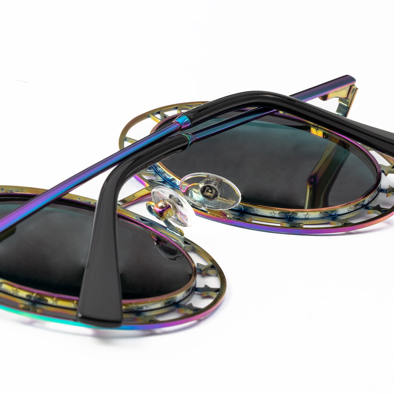 The Walk Of Fame sunglasses feature beautiful star coining on the eye-rim, iconic E star mark on temple tips and a multi-colored irridescent metal frame. The frame features polarised gradient lenses with multi hue effect and 100% UV protection.